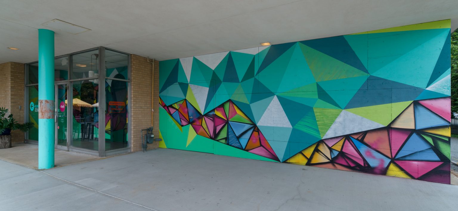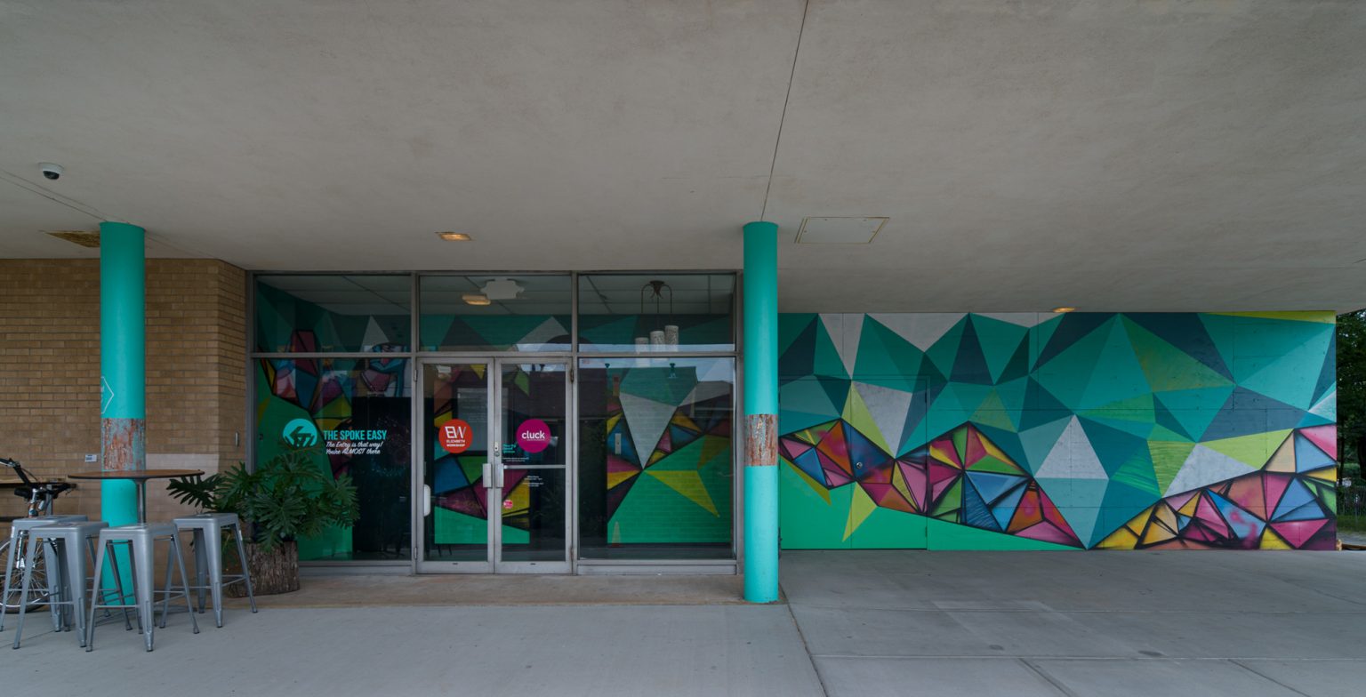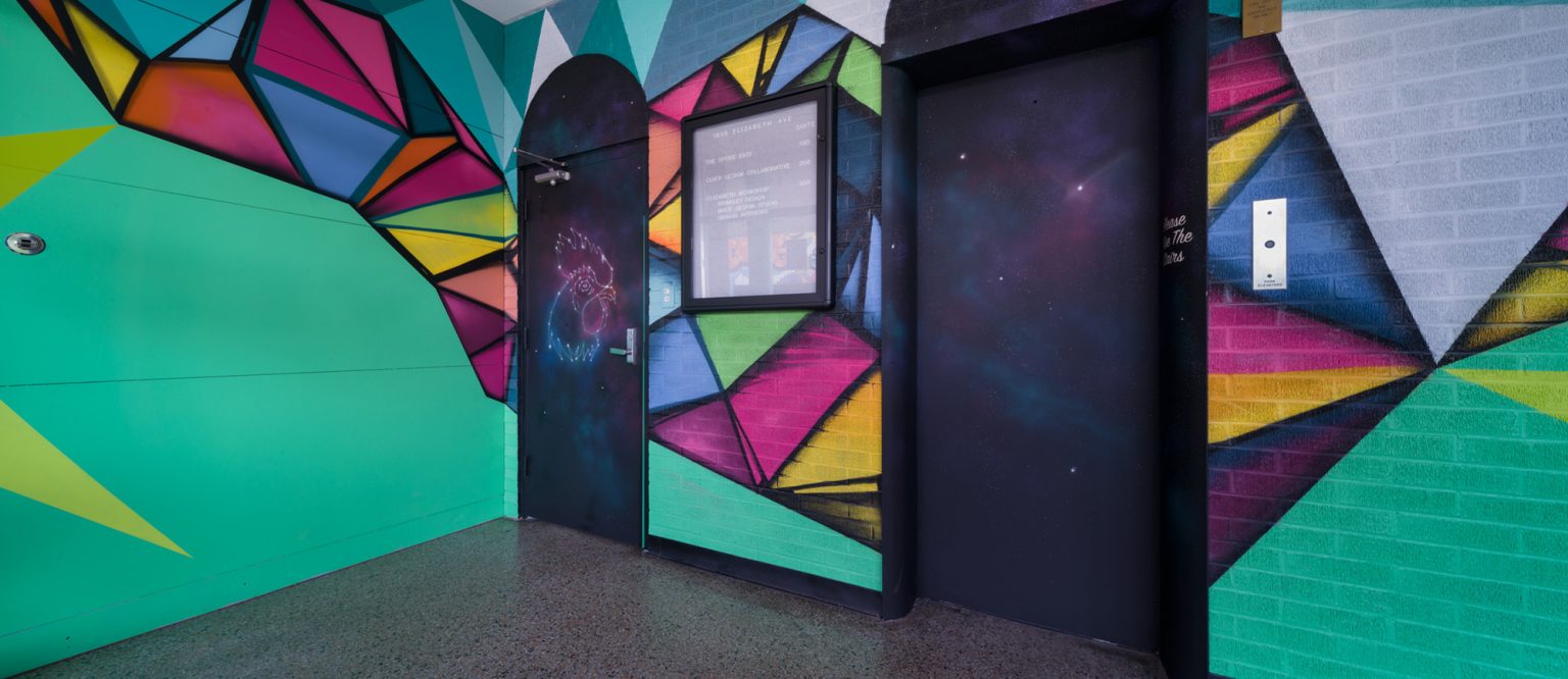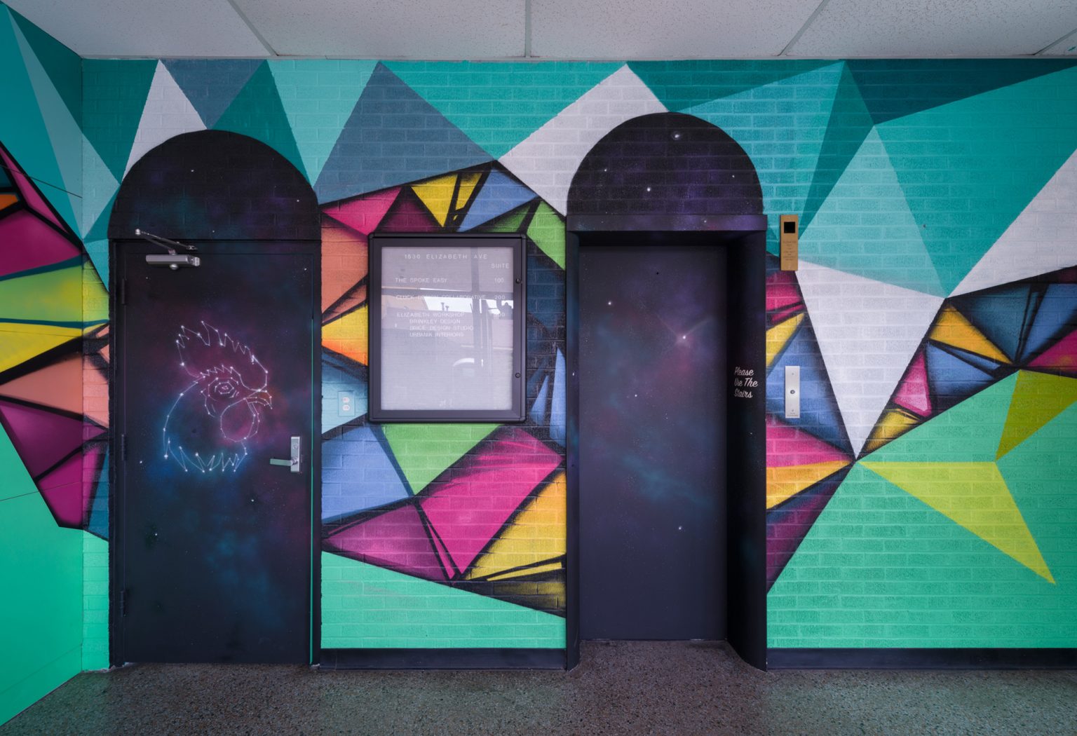 We spoke with @bigtroublestudios, who has been completing commissions in this style since 2008, about his process and his motivations: “For this [piece], we wanted to create a ‘crystal palace,’ which I believe was the nickname for the storage room at the end of the building. [...] The goal was to develop a seamless design to connect the outside wall along that end of the building to the inside/lobby space. I wanted to have a relatively muted colorway with a brighter vein of color going through it, as if you broke open a rock and it revealed a colorful crystal inside.”