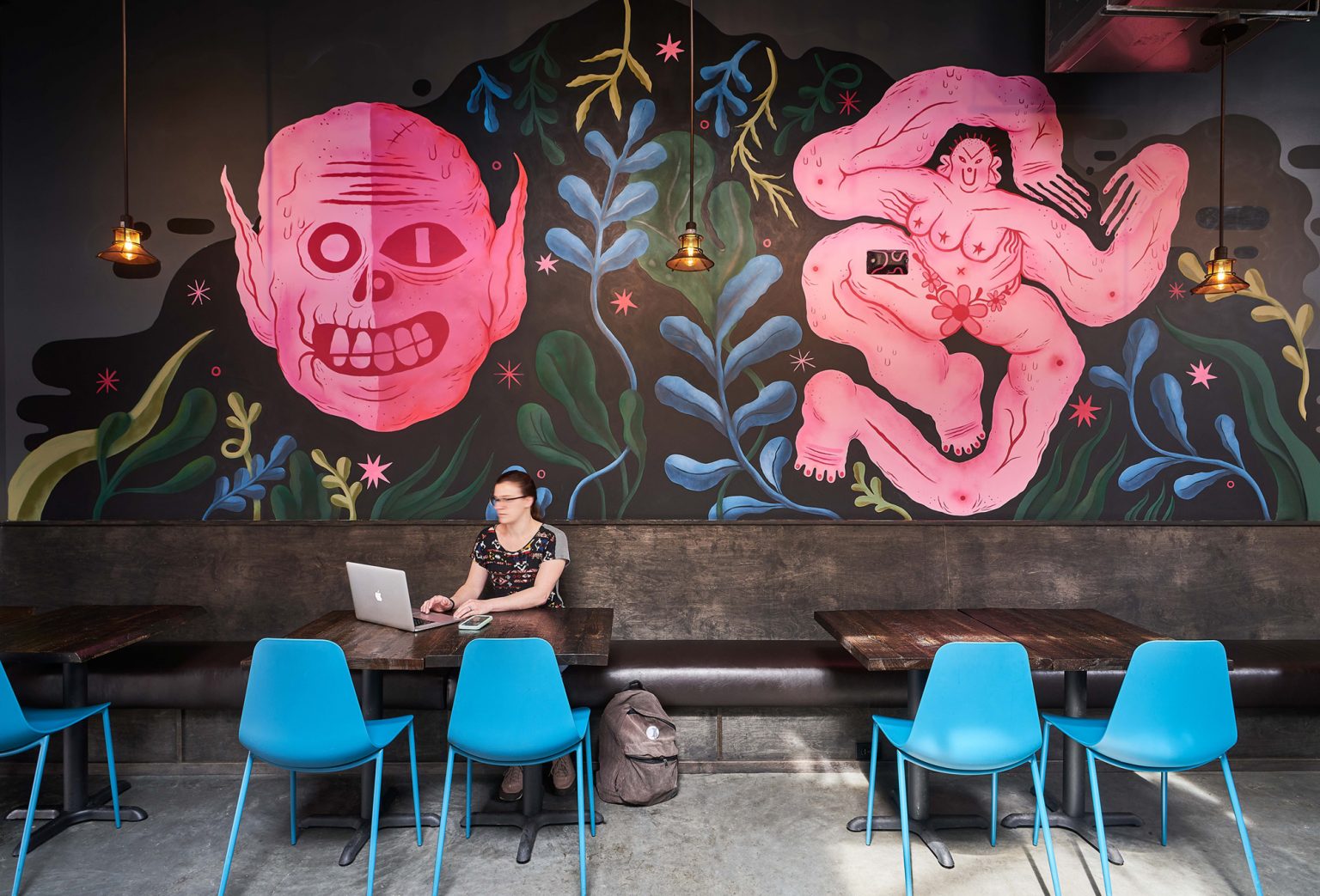 Have you checked out Resident Culture’s new location in South End? We’re honored to be included in this list for one of our favorite recent designs. We worked closely with Maryssa Picket @spud.cowboy, using her iconic artwork to inspire the look of each room. From the enormous skylights and suspended flora, to the disco ball bathroom hall, to Jeff Hamrick @bigbadprop’s massive Lightning Drops sculpture (an homage to one of their best beers), we took every opportunity to kick the design up a notch. We hope you’ll come check out the 17,000 square foot warehouse-turned-brewery, and don’t forget to look up: the DJ booth above the bar is one of our favorite details.