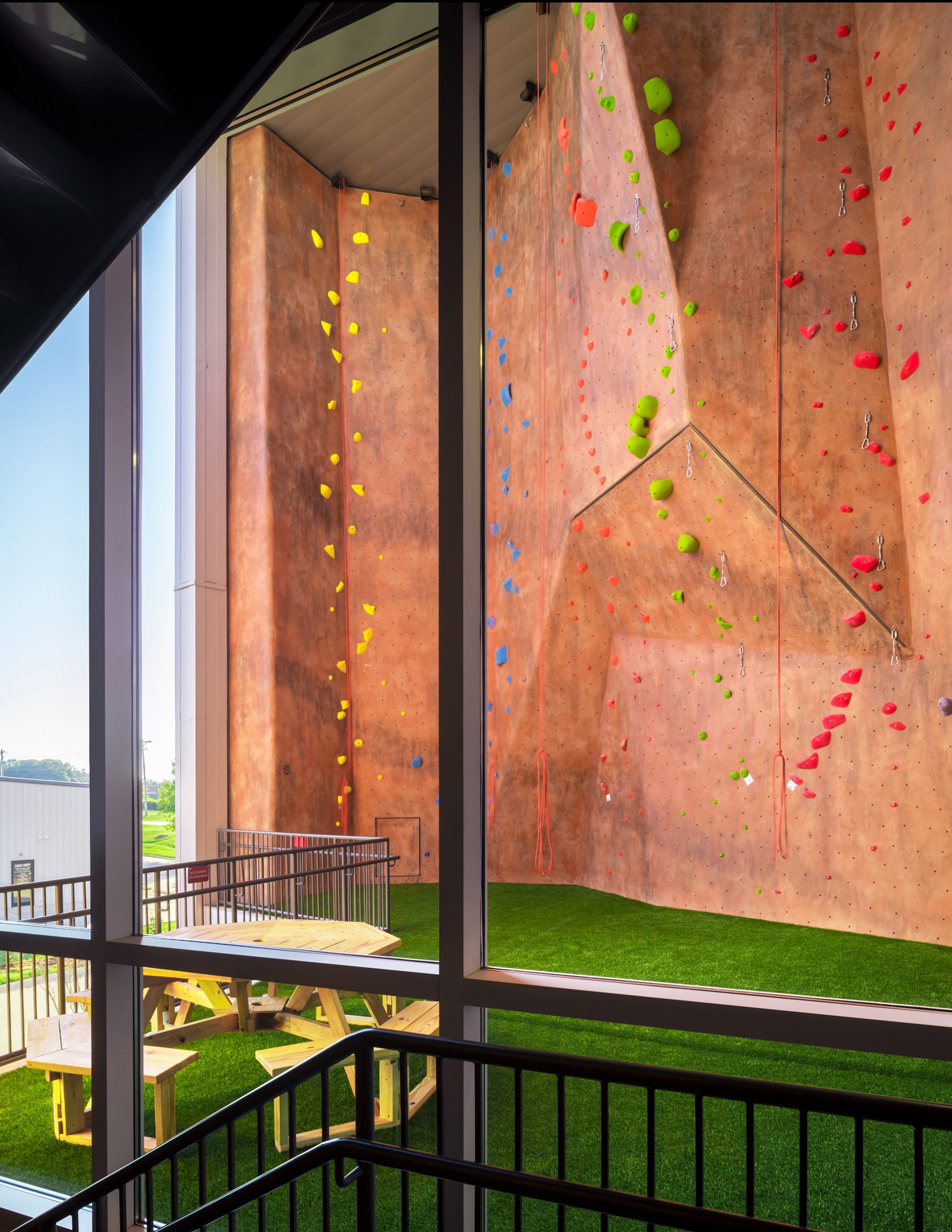 One of the key design objectives was to incorporate North Carolina’s only indoor 15-meter Competition Speed Wall. However, zoning height limitations would have made this impossible without a bit of creativity. Designers achieved this goal by excavating and building below ground. The huge, 50-foot wall section shapes the building to create the apex of the multi-shed roof-scape. The angular silhouette pays an obvious homage to the state’s many rugged ridgelines. The multi-level facility also houses bouldering areas, fitness and yoga rooms, a café, and climbing areas designed specifically for children.